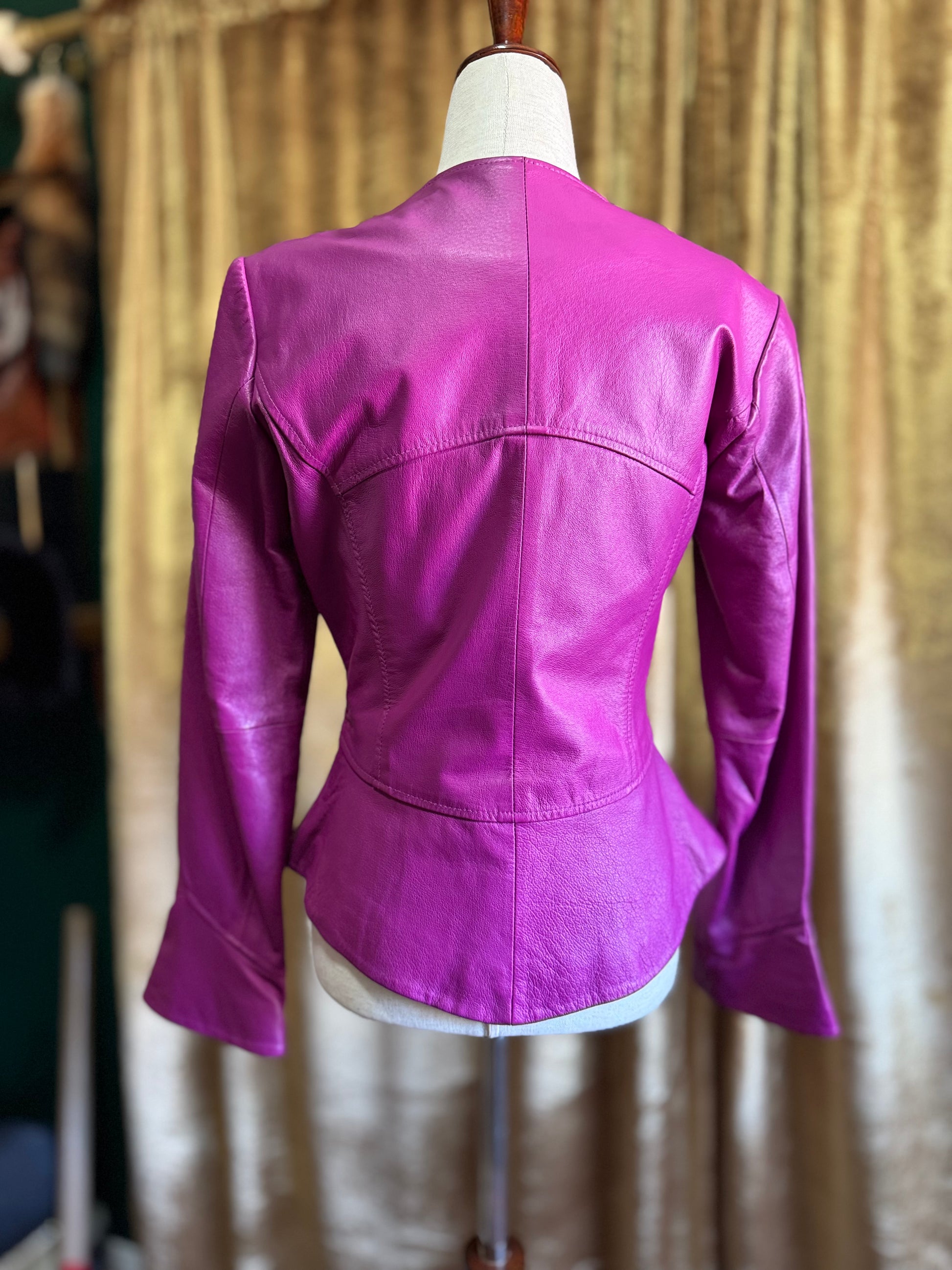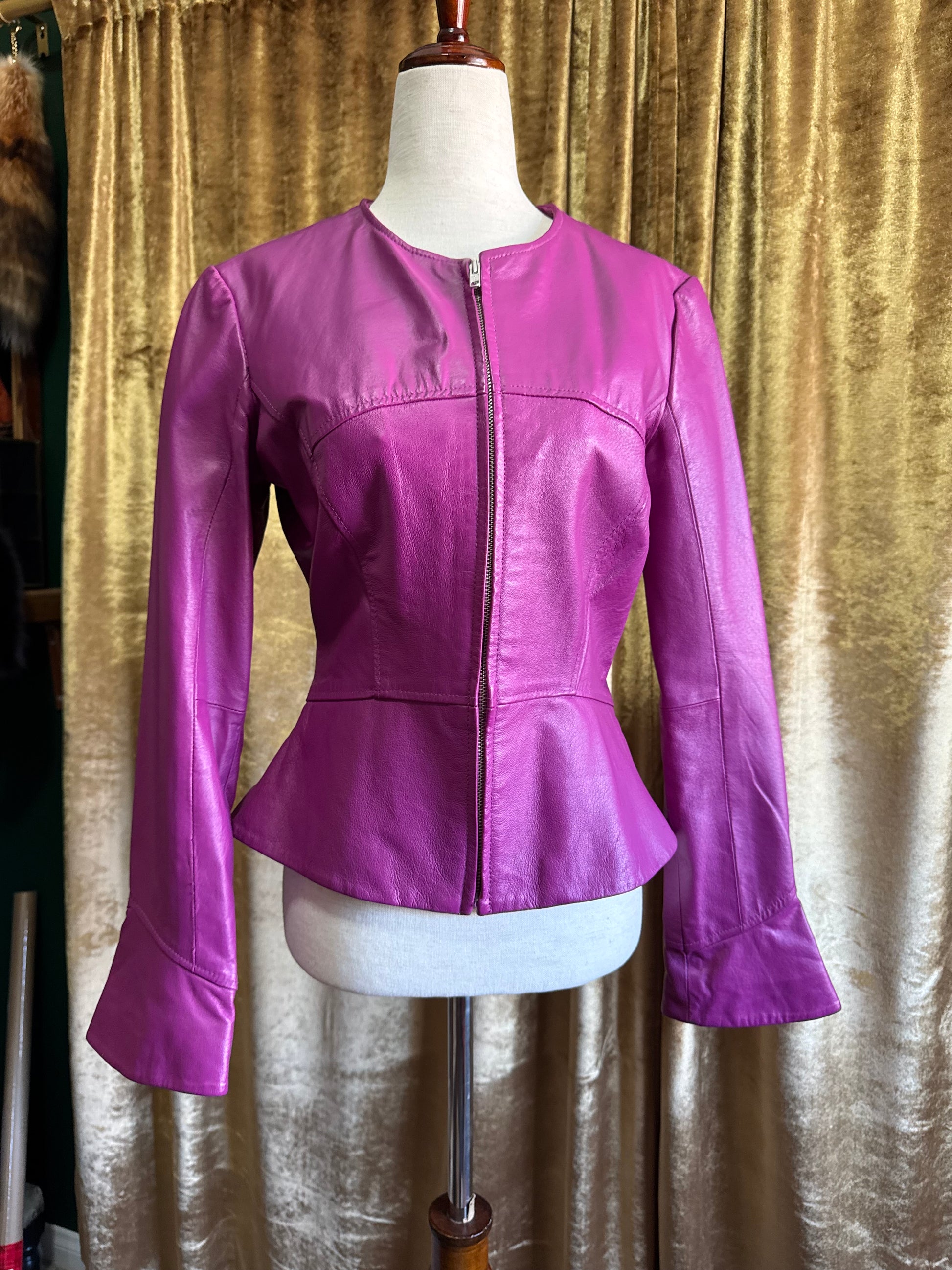 Pre-🩷’d (not vintage) but giving 1990’s. Genuine leather jacket by Shape fx in solid magenta. It’s the cut on this for me …+ the color. 🤩Pulls in at the waist and flares out to the hem for hourglass look. Cuffs also have a little flare. Full zip up to a crew neck collar. Fully lined in nylon. No pockets.