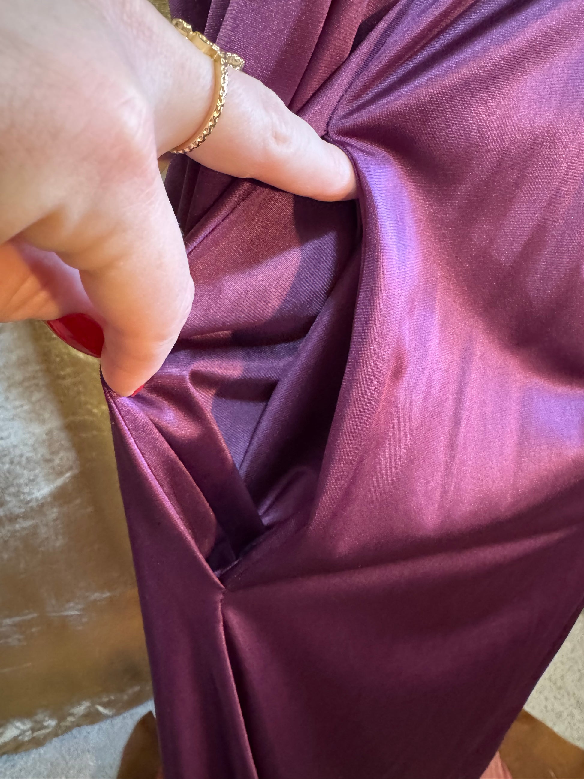 Beautiful vintage robe in a lustrous shade of purple. Long sleeve and ankle-length. full wrap style with interior string tie for added support. Has a pocket. Best guess on era is 1970’s 1980’s. Sleeves have a bit of a Victorian look with a puff at the wrist and snug lace cuff. In excellent condition