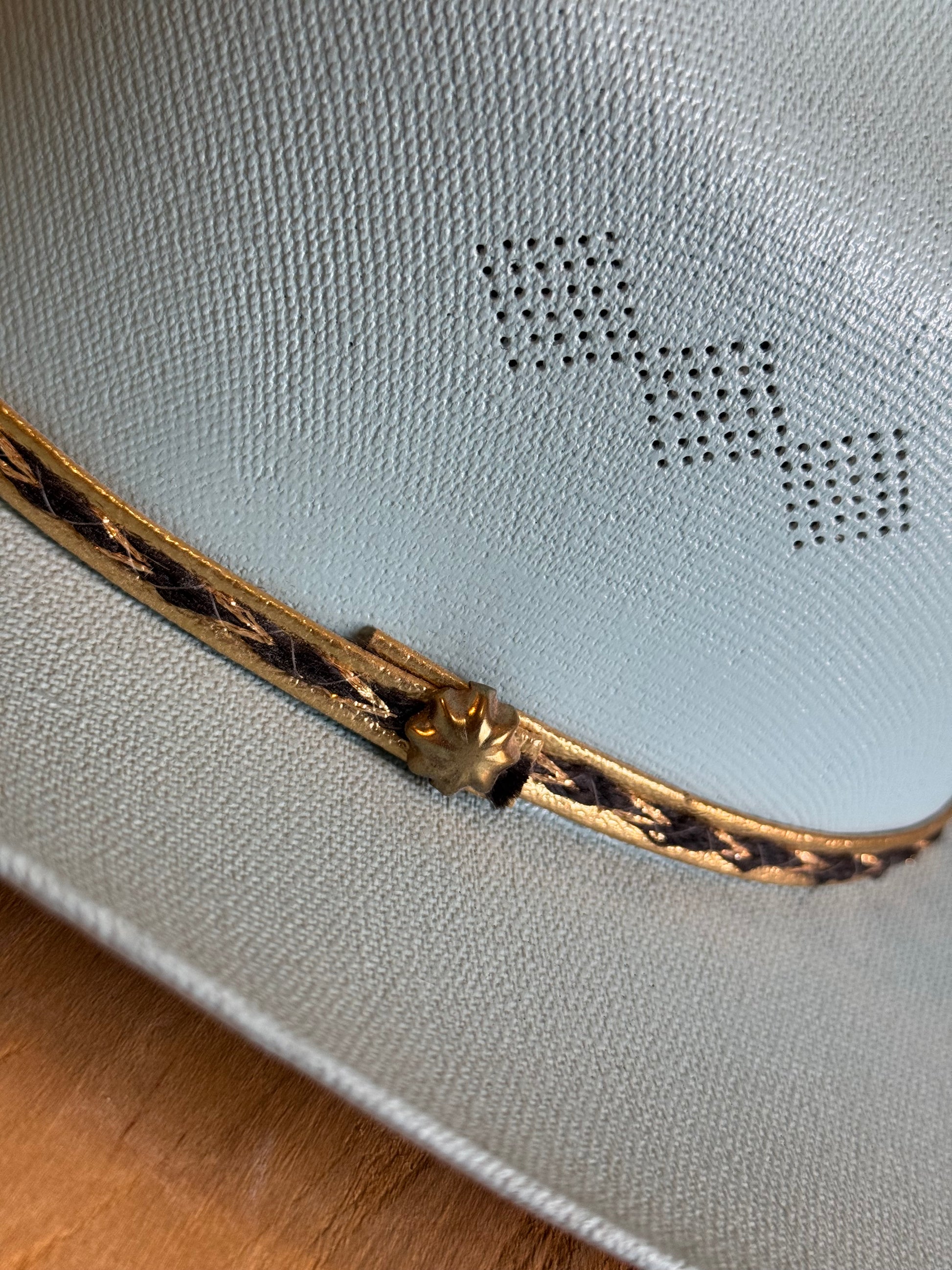 Boys western….🩵 straw cowboy hat in solid baby blue with gold lamé and black braided leather hat band. Complete with gold metal-smithed starburst gold stud. In excellent condition! Available now.✨✨✨