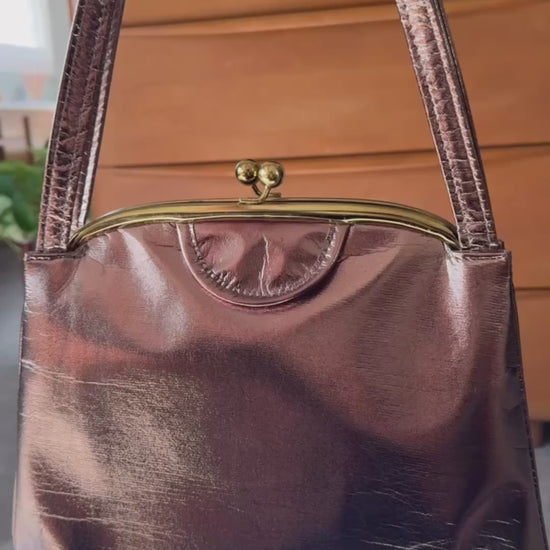 Vintage, metallic bronze shoulder purse. Puff look with pleated detail. Brass tone metal trim around the opening and ball clasp closure. Structured hinge opening. Lined in a tan brown vinyl like material that’s waterproof. One large pocket and one interior side zip pocket.