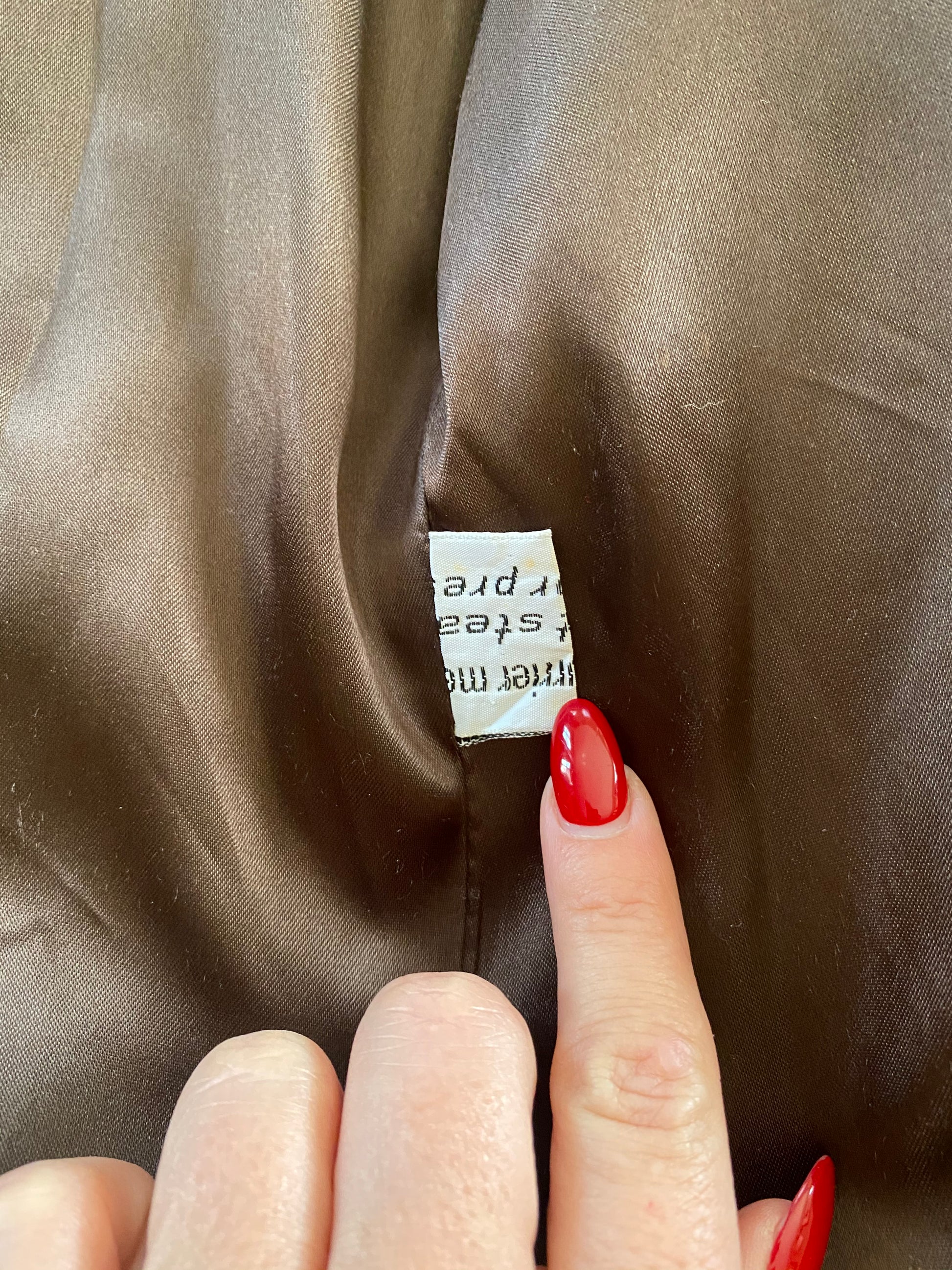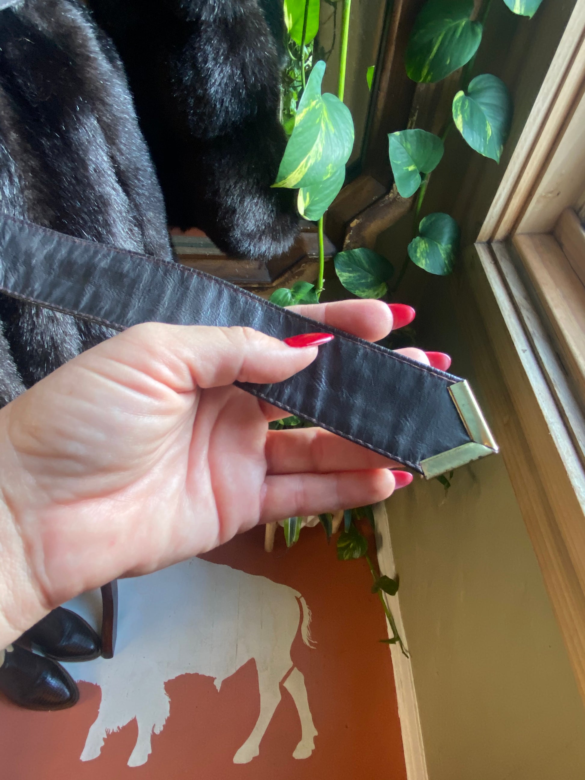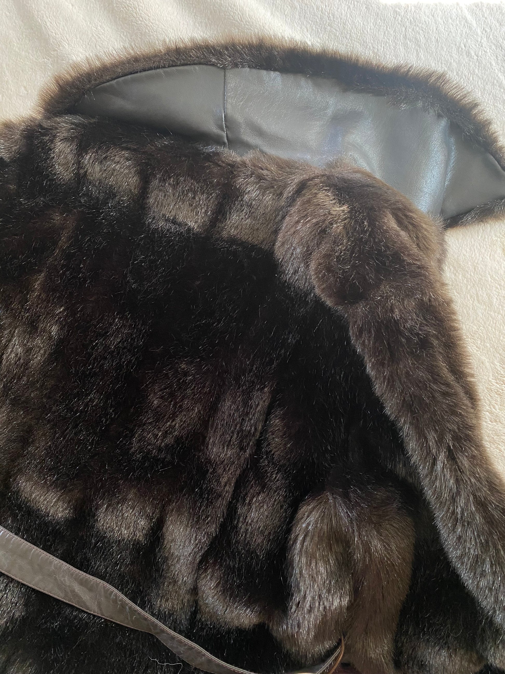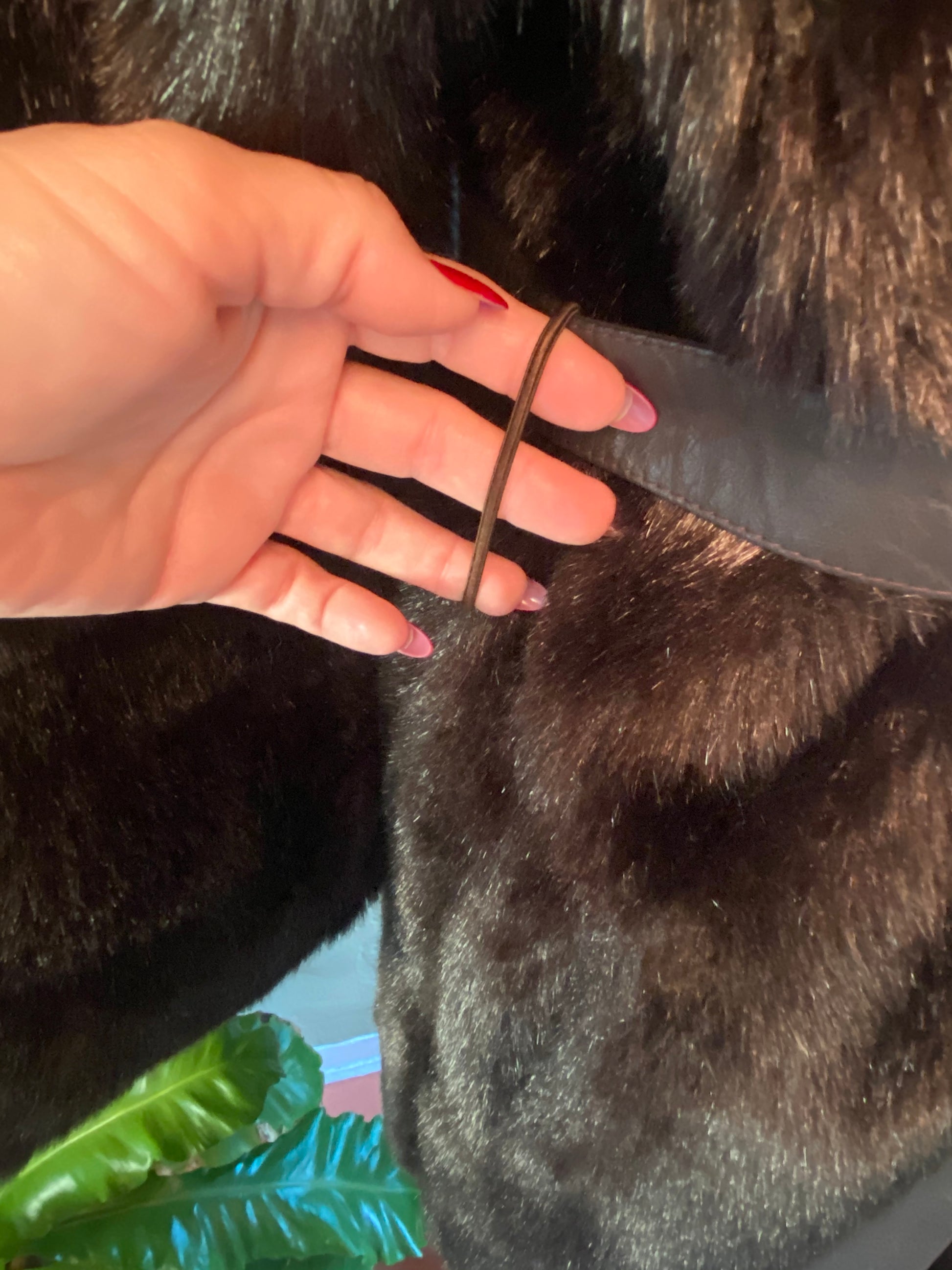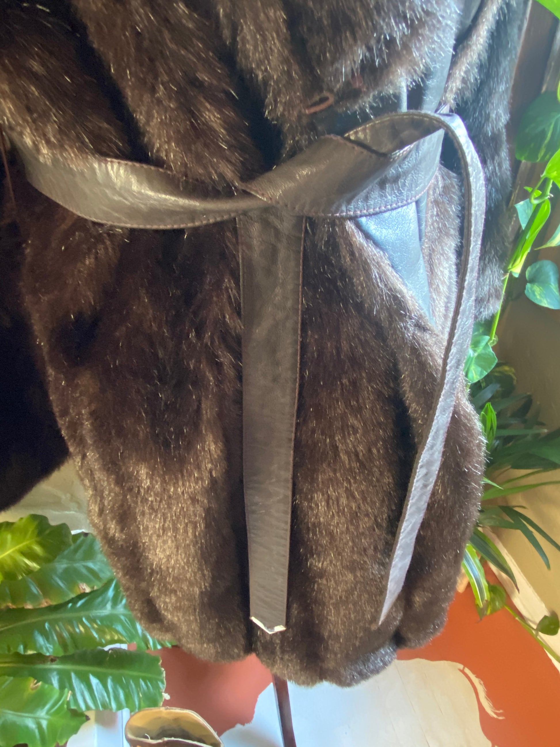 Ultra plush and 1970’s vintage faux fur coat. Beautiful shades of chocolate browns, oversized collar and slightly belled sleeves. Interior lining is in great condition, satin and leather. All original hardware still present and functioning as two front hook and eye closures. Two front lined pockets with visible leather detail. Luxurious feel. Leather belt is original and optional to wear, has some tarnishing on the metal accents. Wide belt loops present and can switch up the belts if so desired.