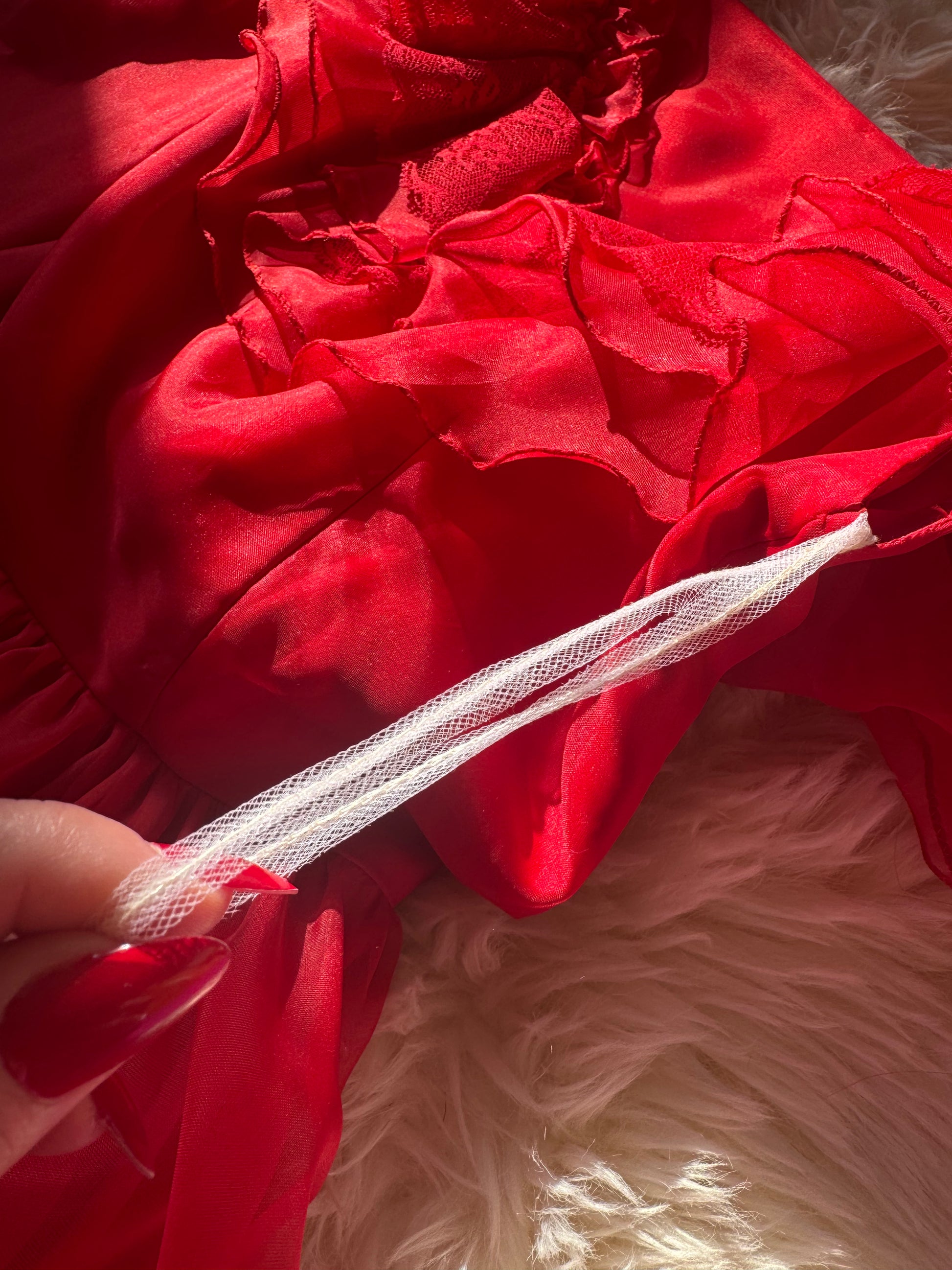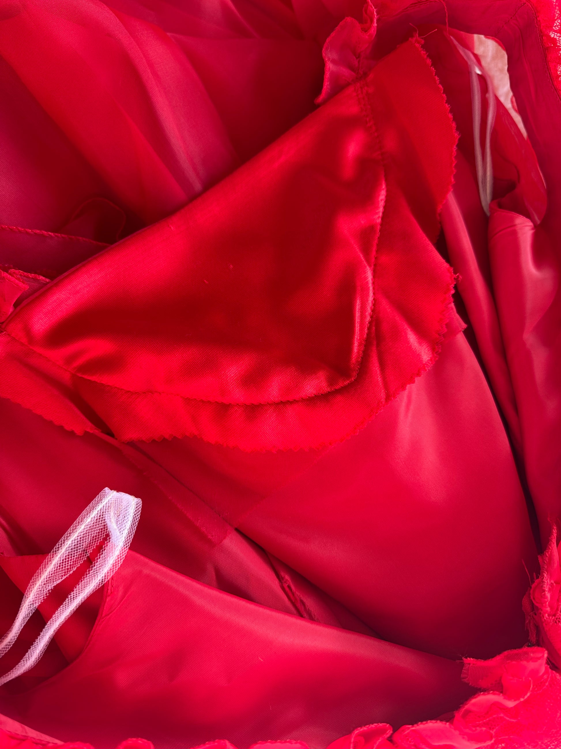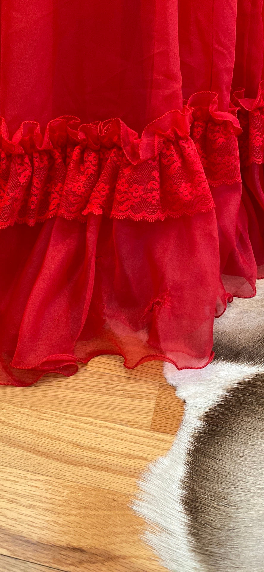 Vintage ILGWU floor length dress in an extravagant amount of red chiffon and statement-size lace ruffles. Waist is a cinched look giving shape and a long a-line silhouette. Top is off the shoulders for a beautiful feminine and alluring appeal with fantastic red lace ruffles surrounding the entire bust. Slip on style and has a zipper down the back complete with a red organza bow and small snap at the center waist. Neckline is a fairly conservative modesty panel look, however can always easily be altered by your go-to tailor. Back is scoop from shoulder to shoulder. Skirt and bodice ae fully lined.