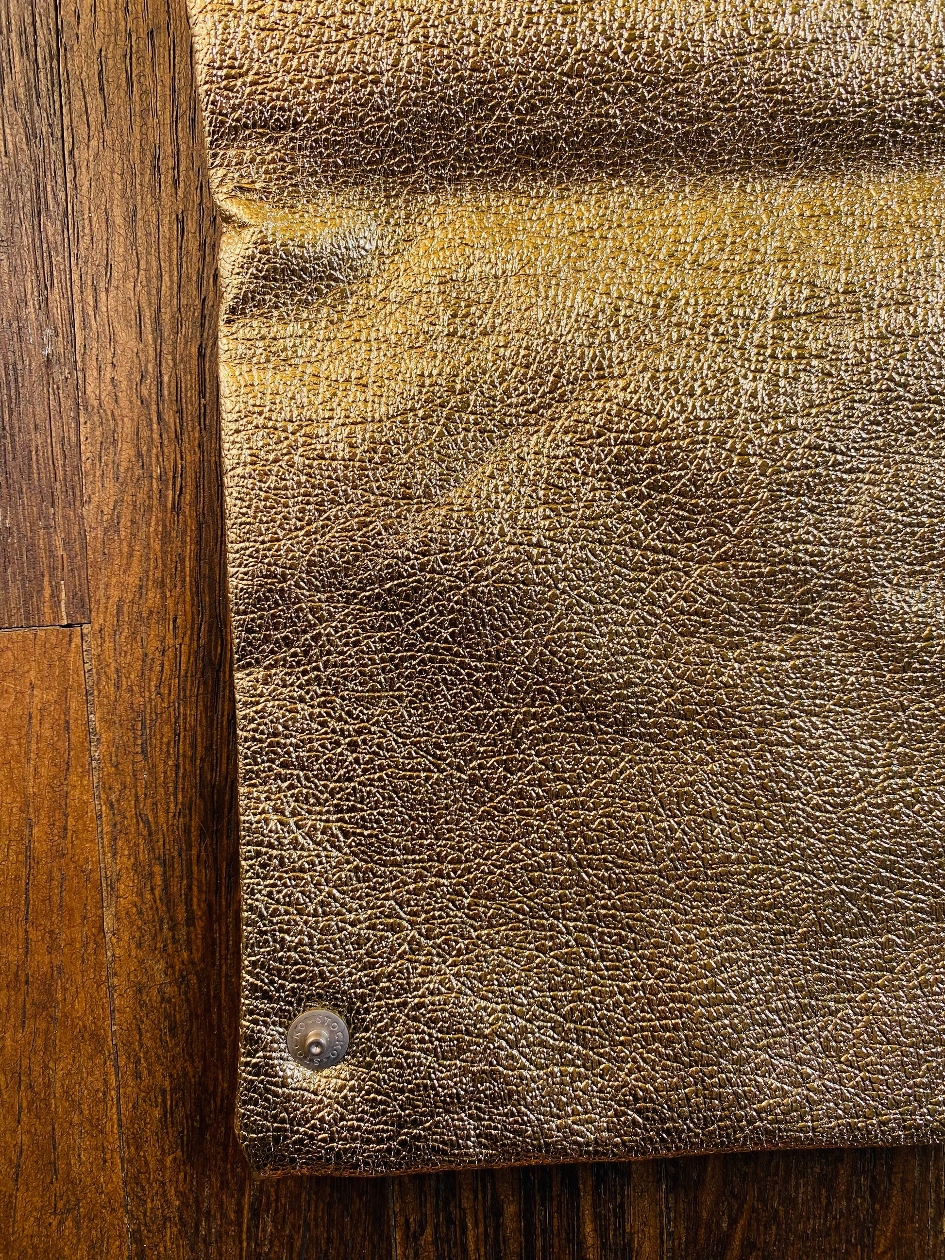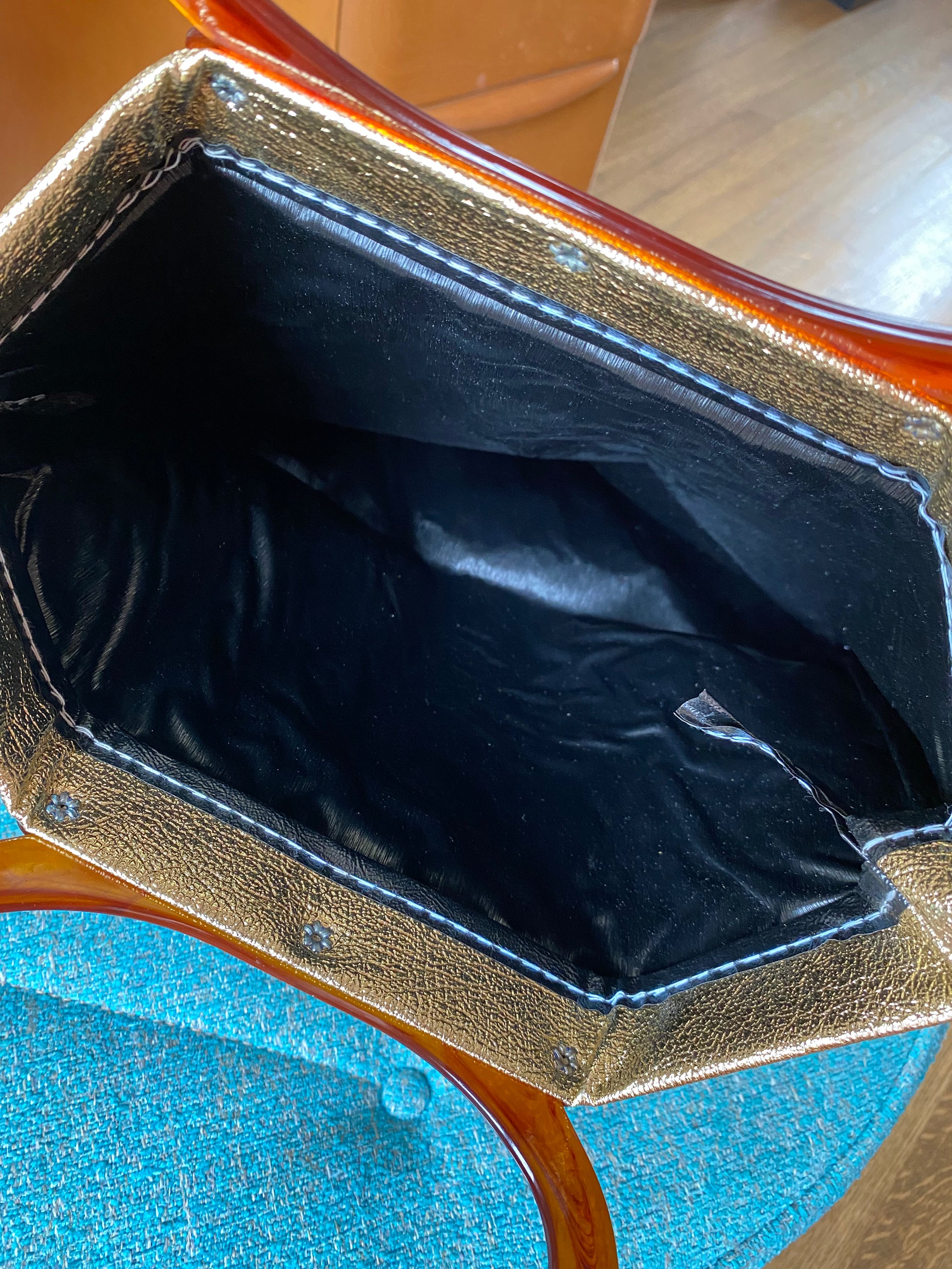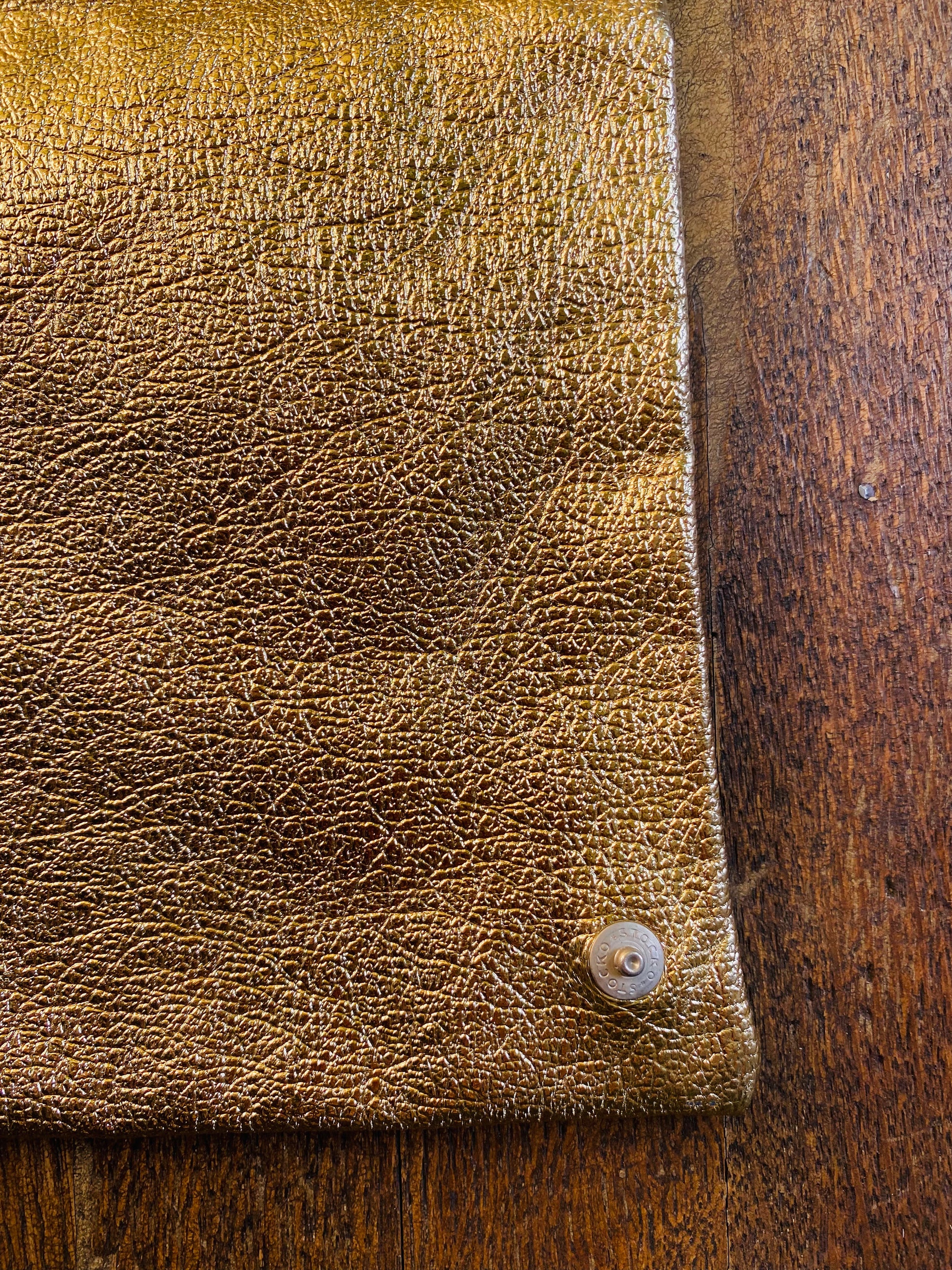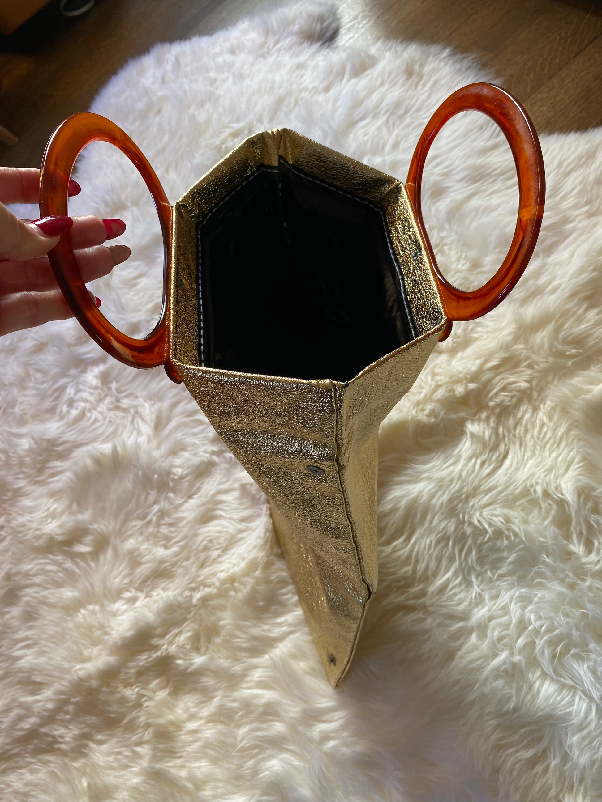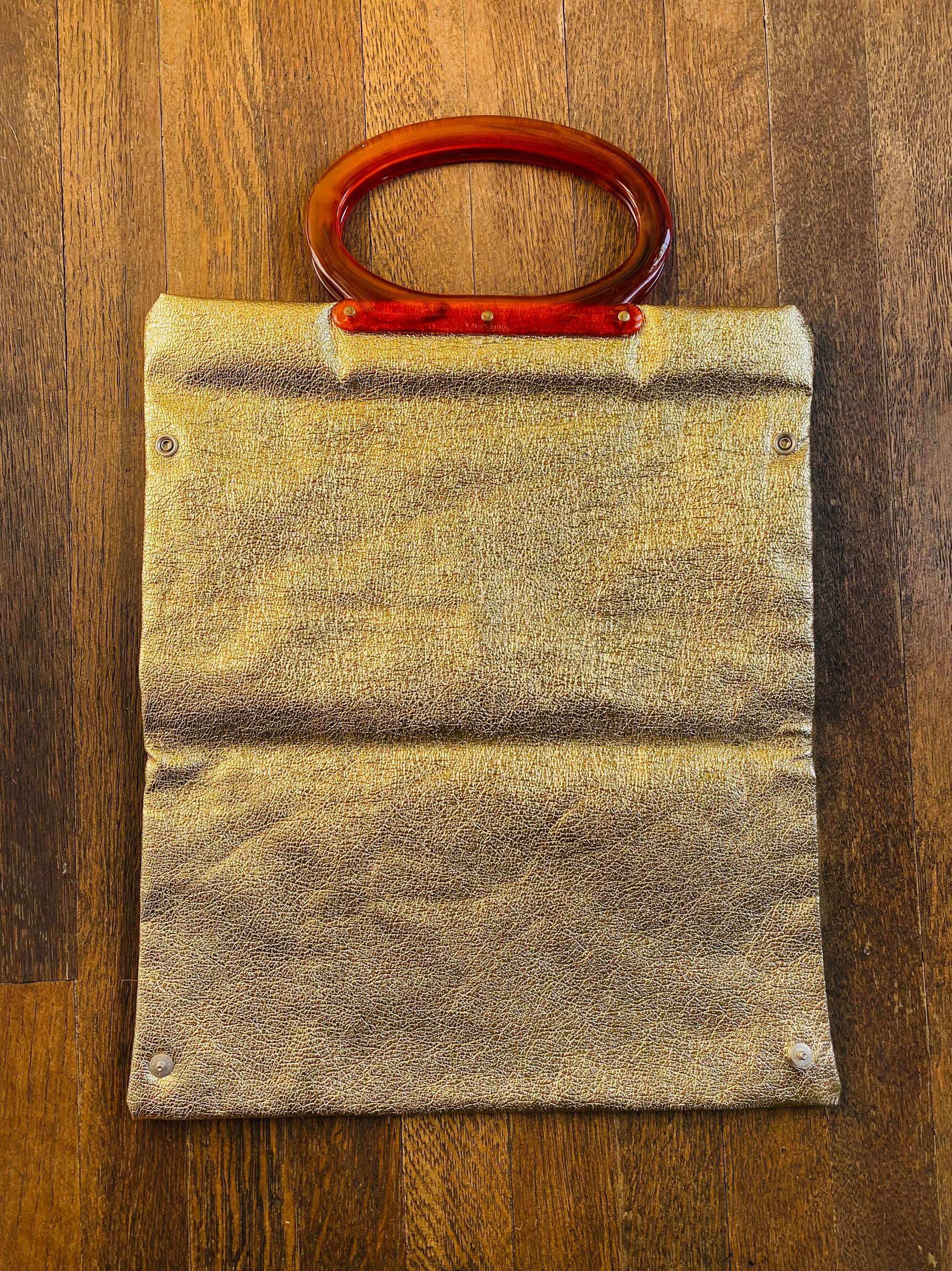 Gorgeous and fabulous 1970's disco era vintage gold lamé purse. Crinkled texture amplifies the metallic gold shimmer perfectly. Rectangular in shape with large marbled tortoise shell lucite handle that's just the cherry on top! Fits comfortably in your hand. What makes this bag ultra unique is that it can be worn one of two ways; as a larger bag similar to a tote or smaller bag similar to a clutch. As pictured, the bag folds in half and has snap buttons at each side to keep it in securely in place if you prefer to wear it on the smaller side. When opening the handle splits in half to reveal a large open pocket that looks to a be lined in a black waterproof material - possibly a vinyl type material. Love everything about this handbag!