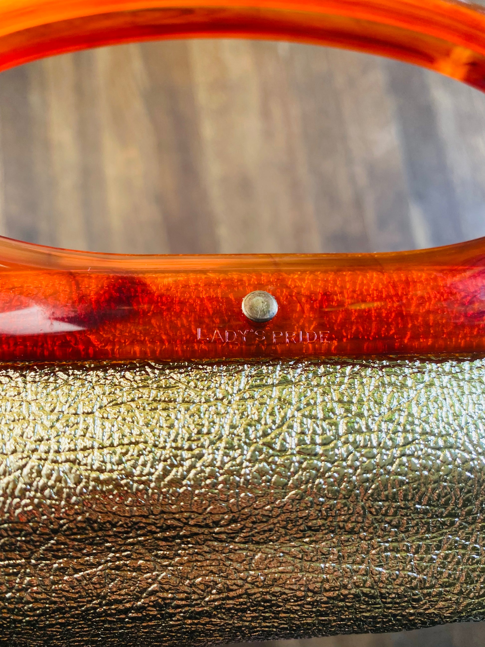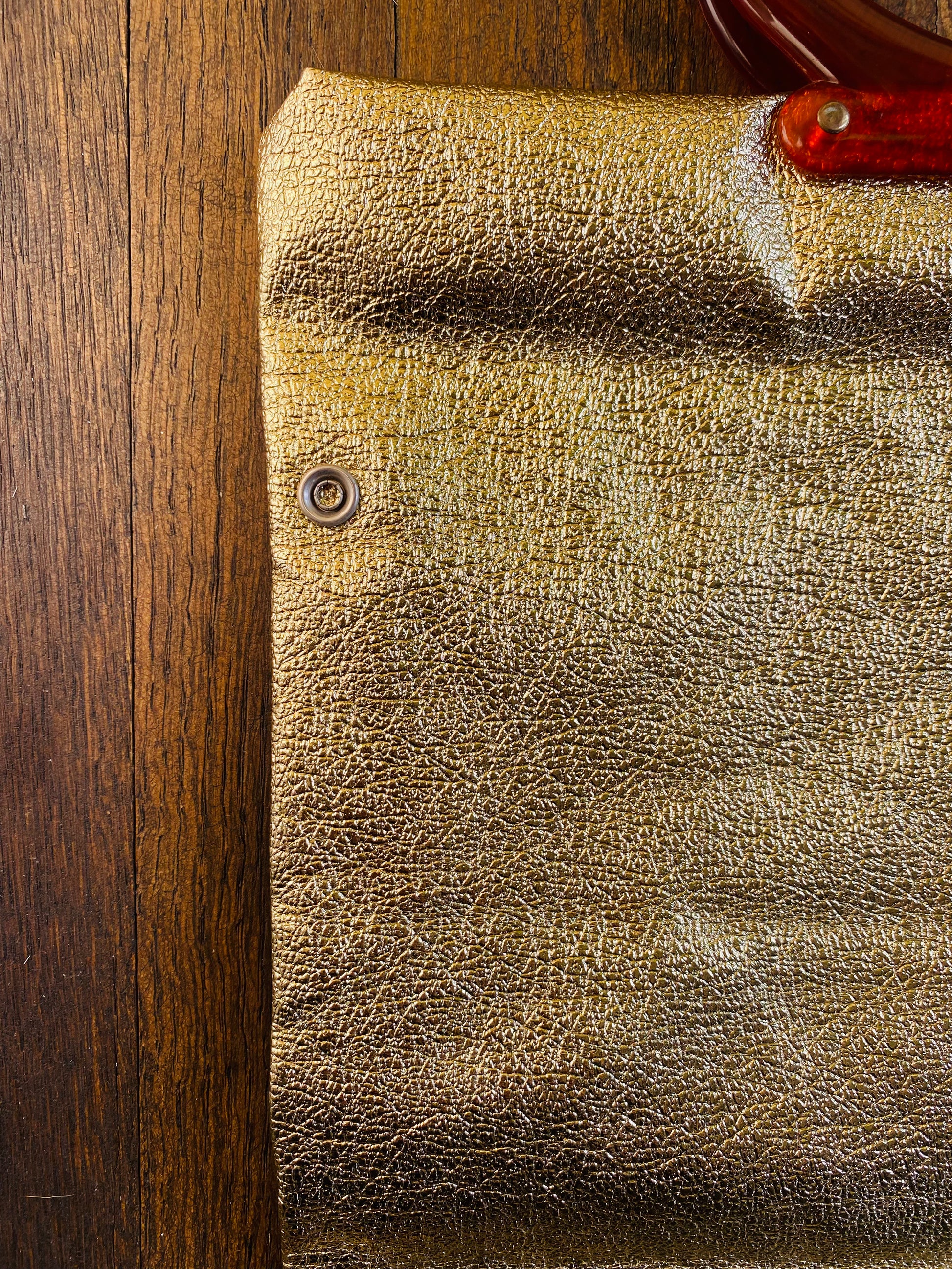 Vintage Gold Lamé Purse, Clutch, Folding Handbag, 1960s 1970s, Snap Button, Cognac Brown Lucite Handles, Disco Queen