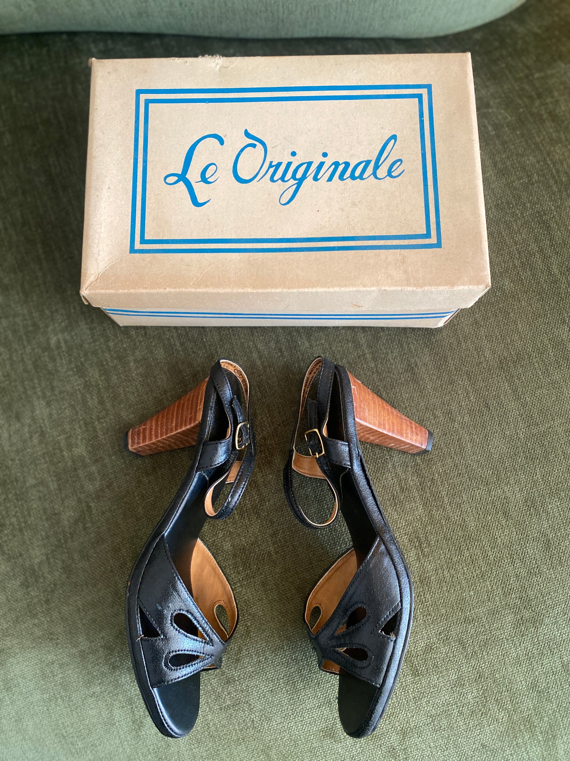 Vintage 1970’s high heels in black w/ wood stacked heel. Cutout design in the upper. Ankle strap secures with a small brass-tone buckle and is adjustable. Comes with original box. These are so comfortable and the material does have some give to it. The fit and feel is similar to professional dance shoes.