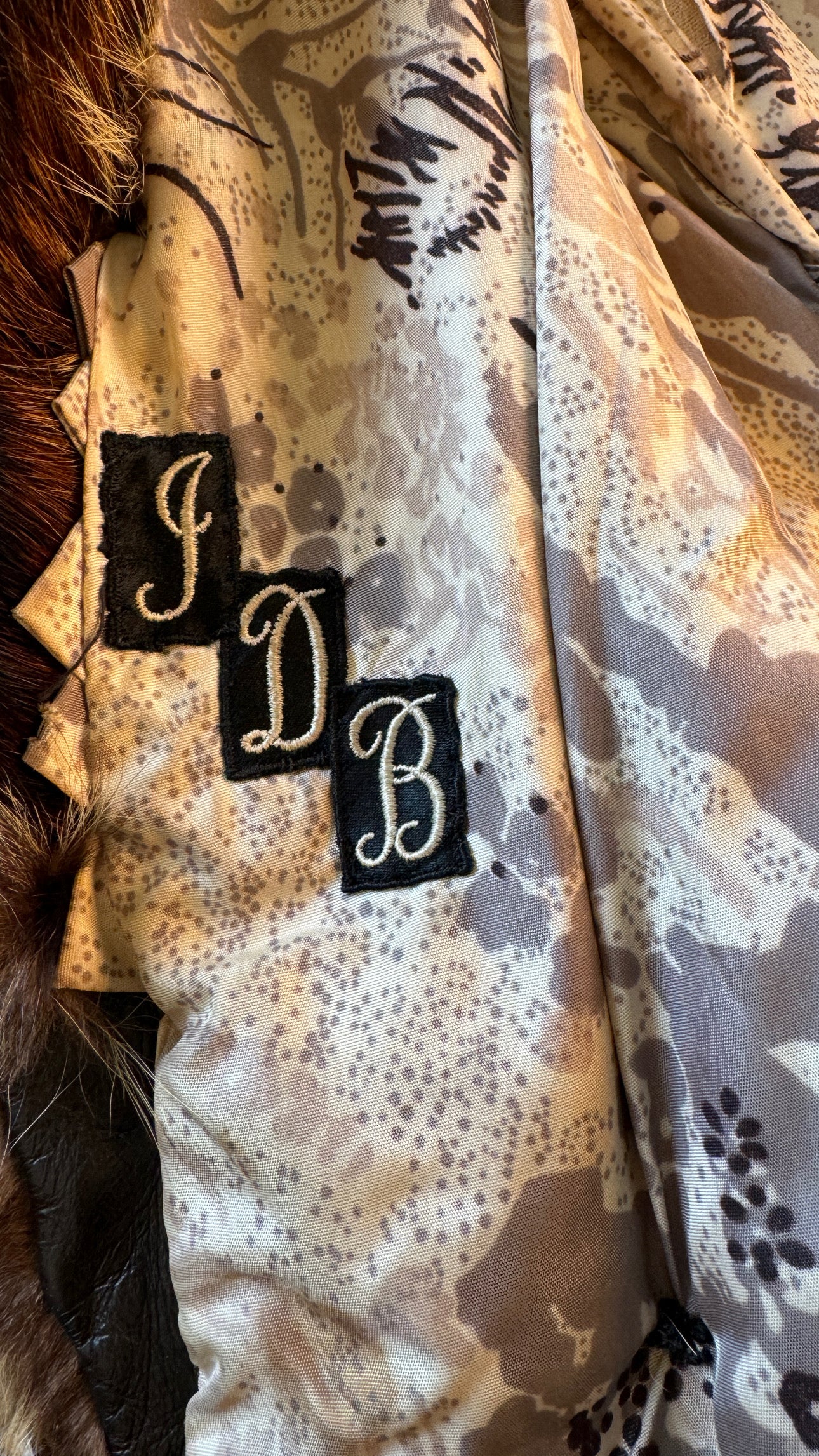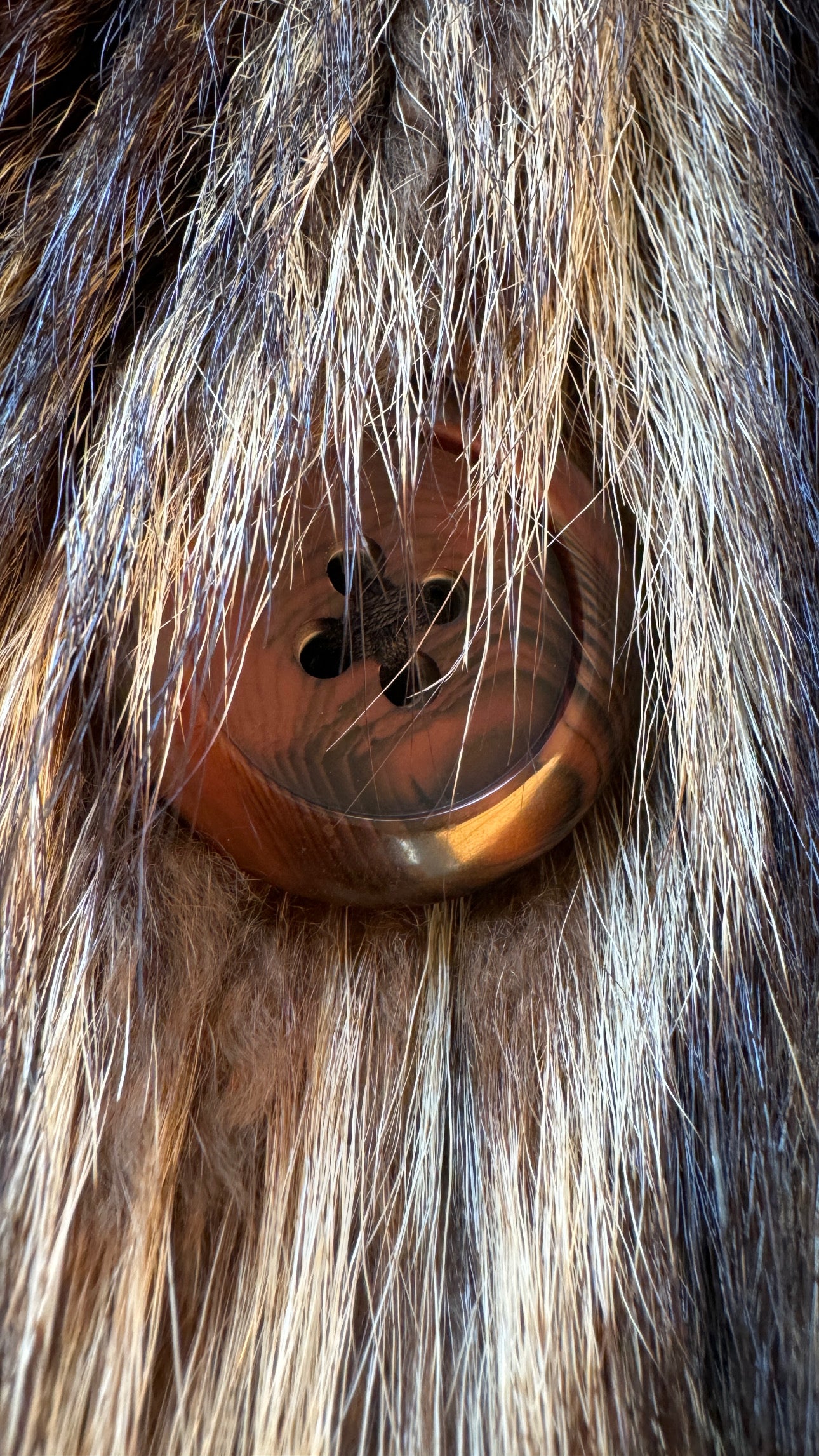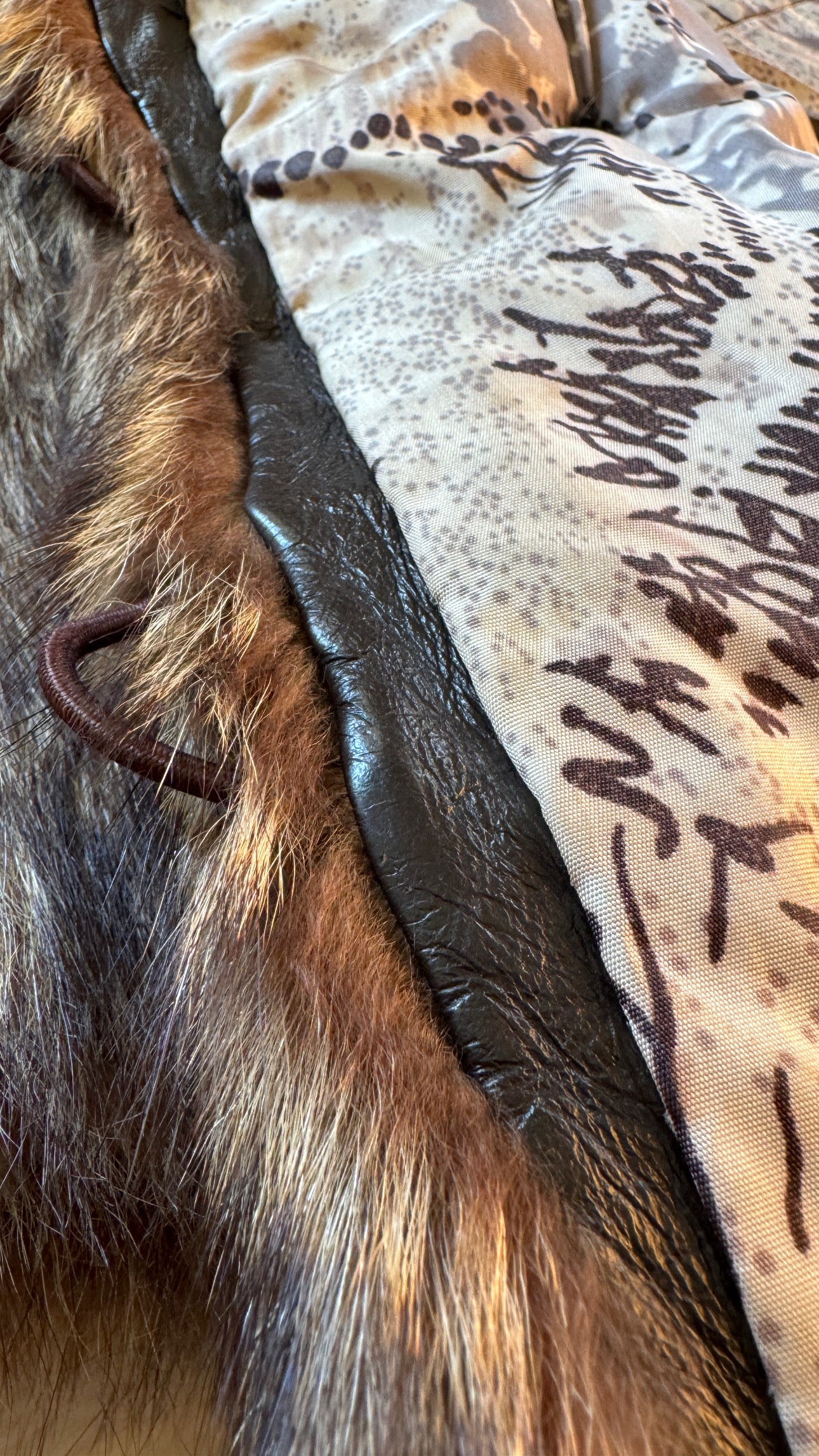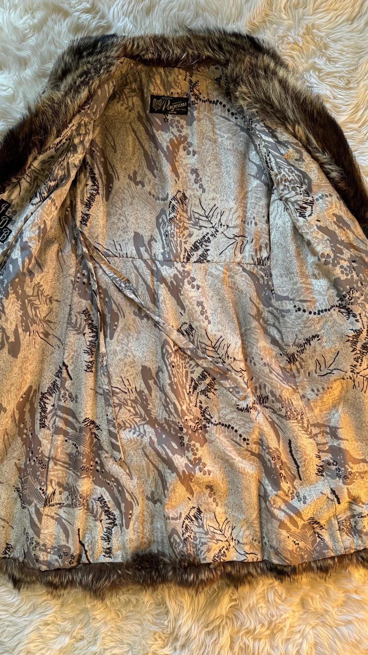 Genuine vintage raccoon fur coat by Lachine. Raccoon was popular in the 1920's and faded in popularity in the 1930's. Long heavy & warm. Lustrous shades of browns and black blended throughout. Fur is dense and the quality can be seen and felt. Extremely soft and decadent. Button closures down the front. Two hidden, deep side slit pockets. Fully and gorgeously lined with original owners initials embroidered. Pristine vintage condition.