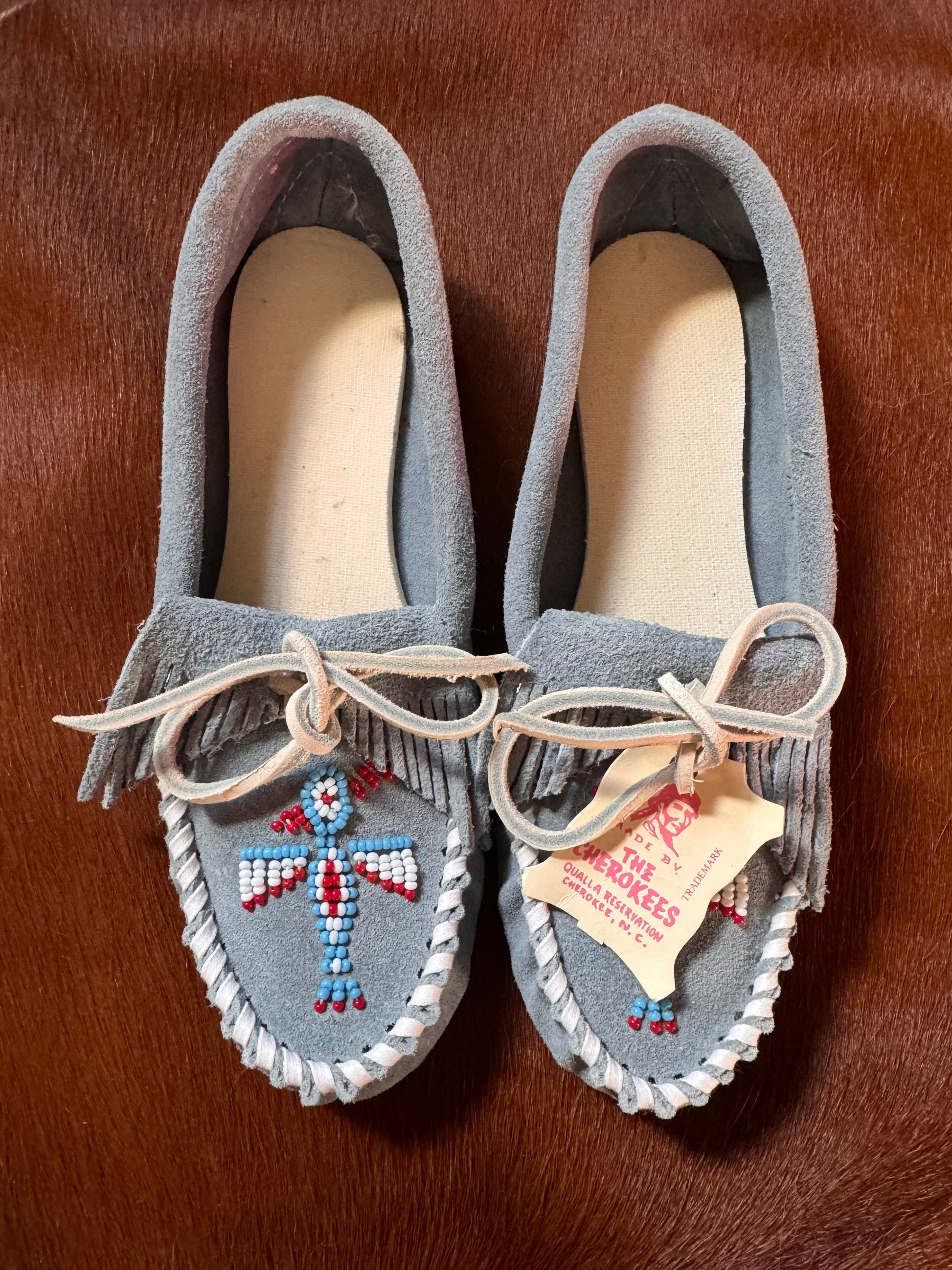 Pretty vintage mocassins in a pretty baby blue. In excellent condition. Beaded Thunderbird on each. Leather soles, foam insoles. Leather lace bows on each.