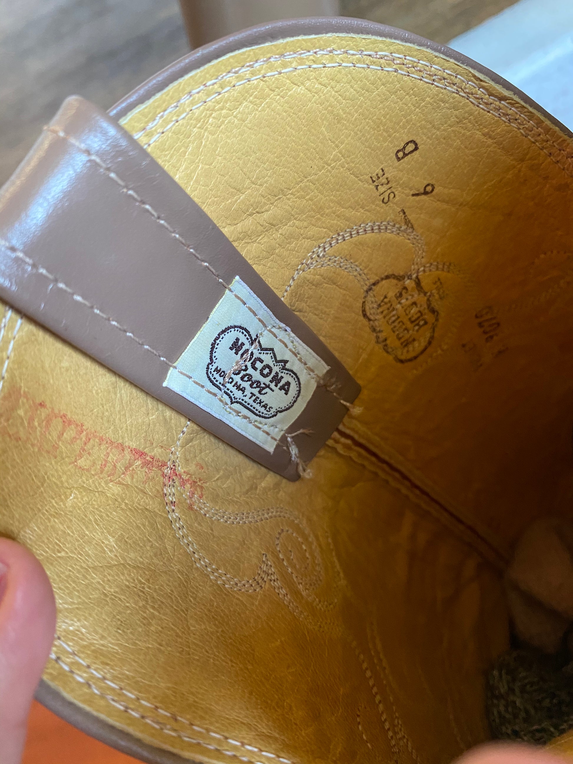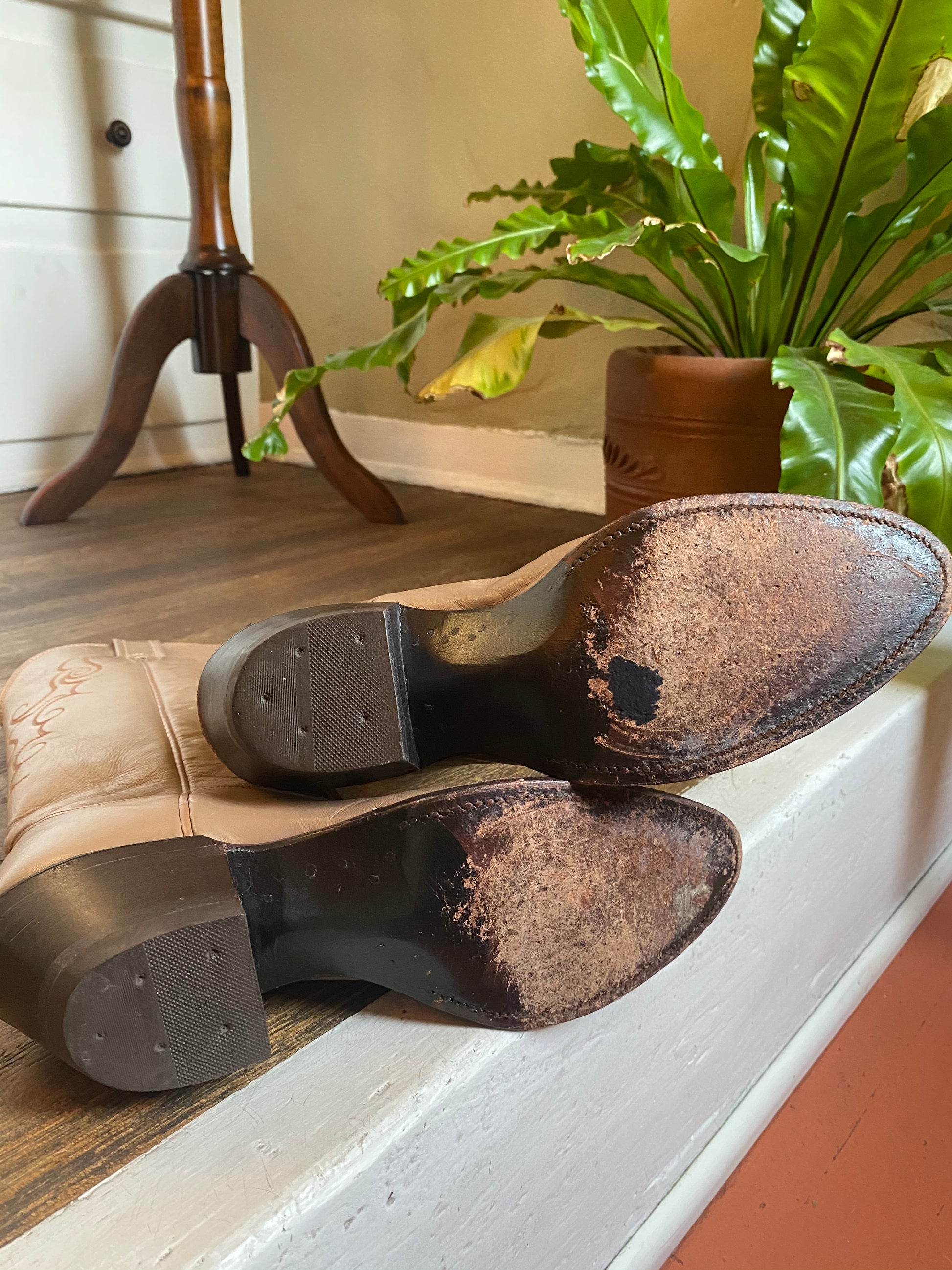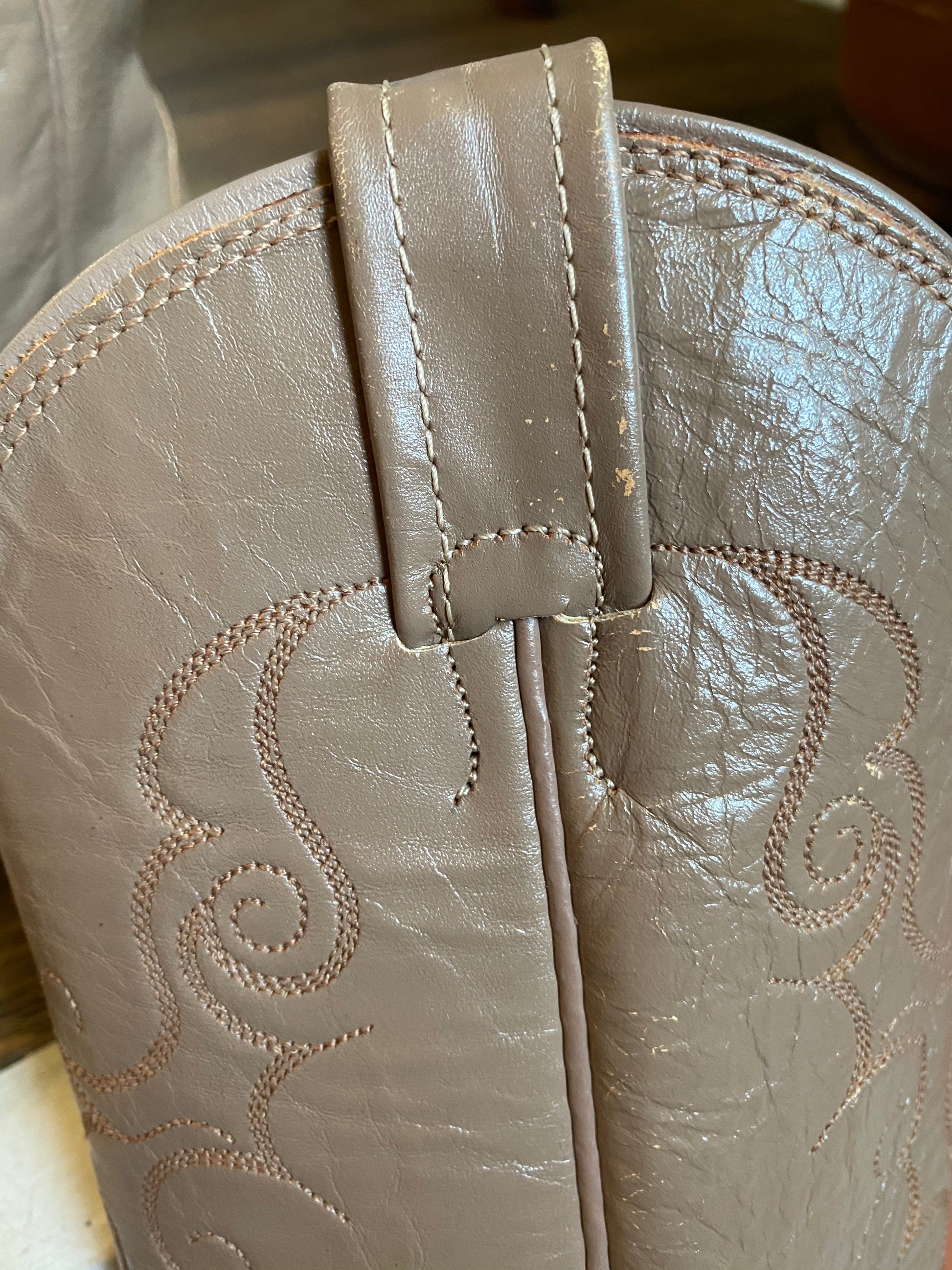 Vintage Nocona brand cowgirl boots. Made in Nocona TX. Genuine leather all the way through down to the insole. A heavy and good quality pair of boots! No lining, just leather. Color is a solid ashy tan with peachy colored stitching through the shaft design, around the instep and heel. Good vintage condition. Nocona brand tags in each and stitched into the bootstraps.