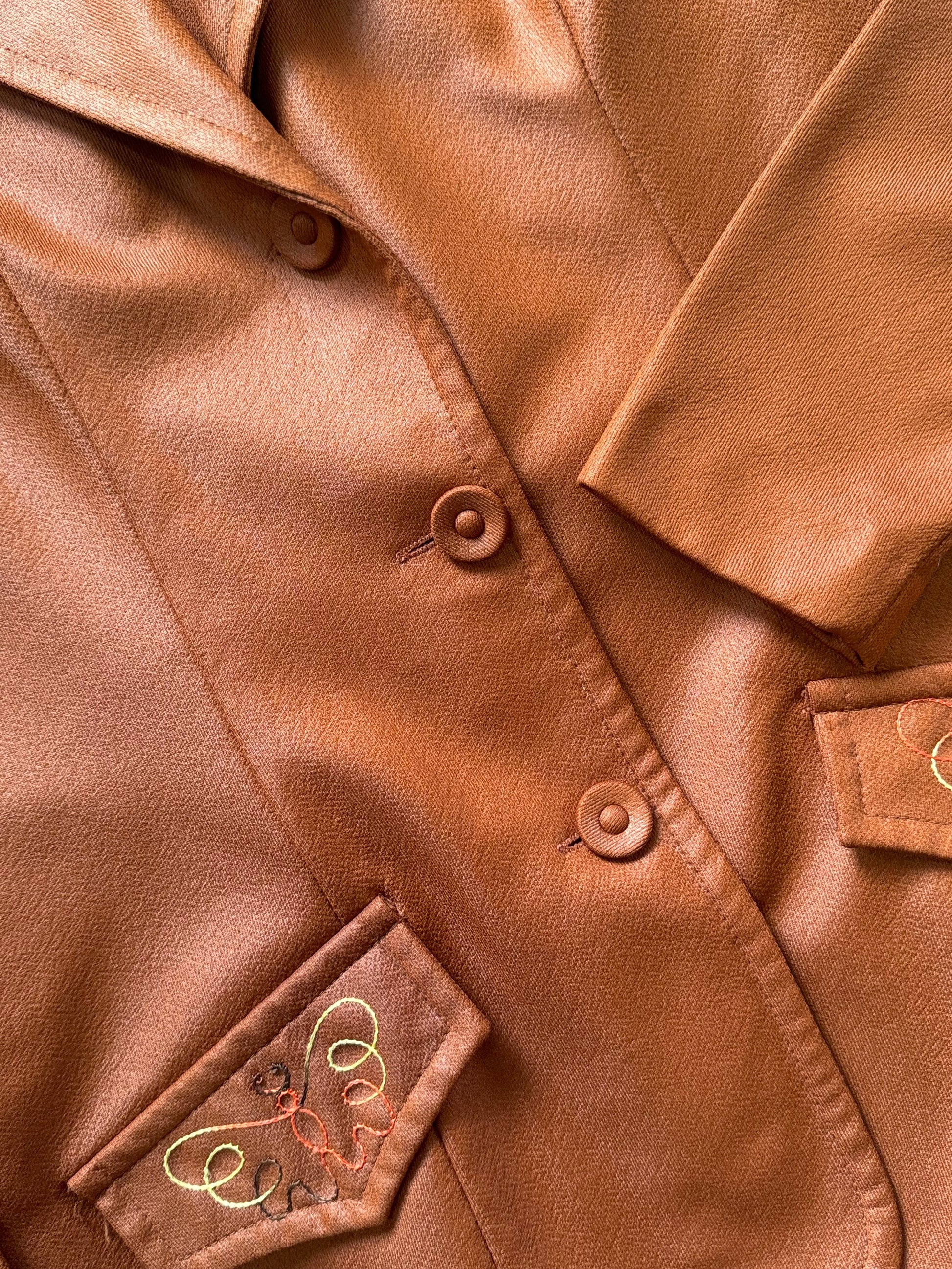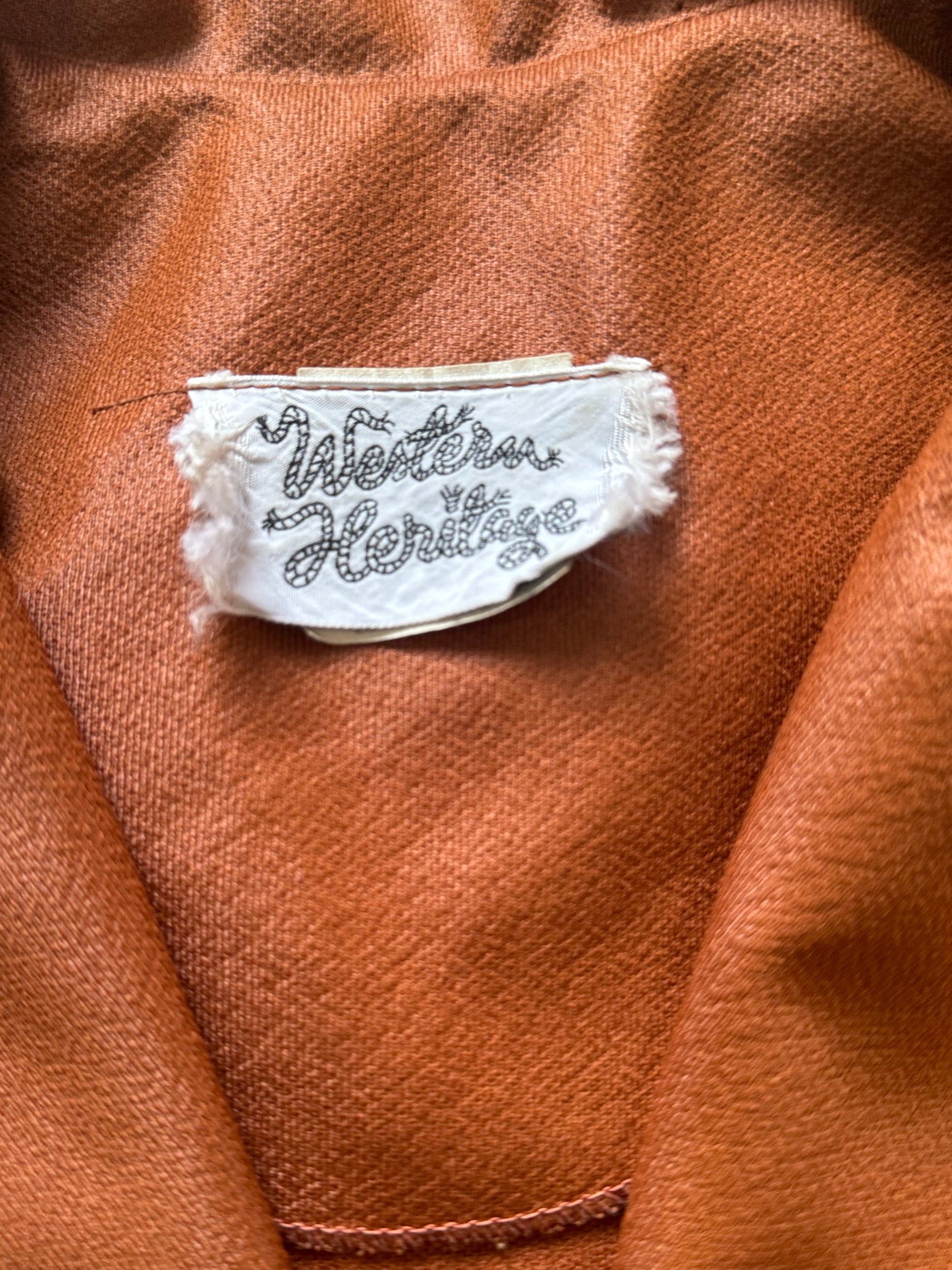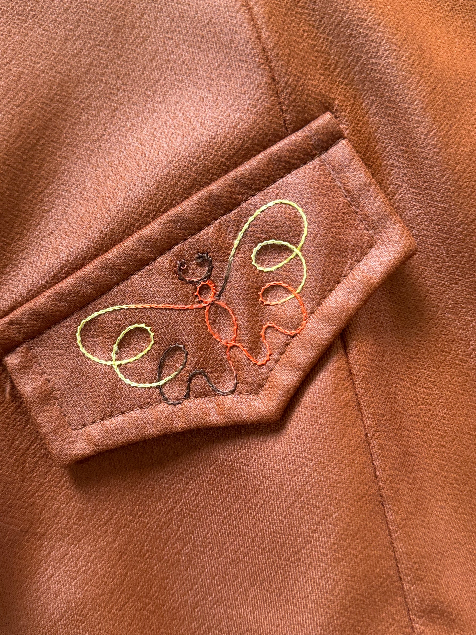 Vintage western suit set by Western Heritage. In excellent condition. Rusty brown iconic 70’s color. Jacket has large collar, fabric covered one-inch buttons down the front. Mock pockets with chain stitch butterfly embroidery in orange, yellow and brown. Pants are perma prest pull on flares with elastic waist, faux pockets and western belt loops. Side single stitch design on each lower outer pant leg in the same colors. Material has some stretch to it. Such a cool set!