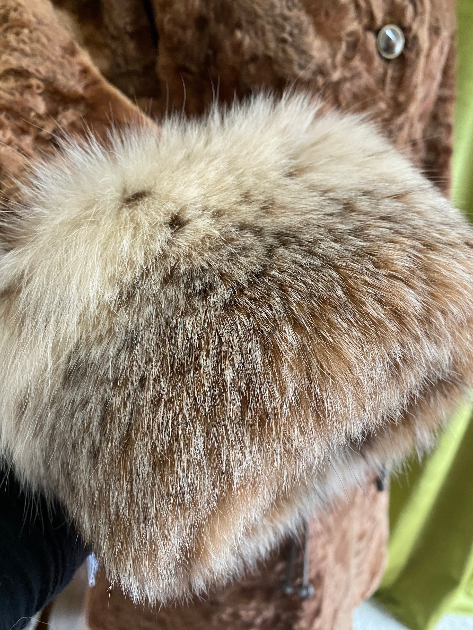 Absolutely stunning combination in this lustrous women's vintage Lepp & Company coat. Made from curly lamb fur in an ultra shimmery warm bronze. Adorned with plush fox fur collar and oversized cuffs in spotted ivory and shades of cognac brown. I would date this coat as being made in the 1950's or 1960's. In excellent condition and superb quality. Shows no signs of age, brittleness or shedding. Warm, stylish and cozy. Noticeable stitching at the waist for cinched, tailored look. Fully lined in a lustrous dark ash brown sateen polyester blend with the most luscious velvet one-inch strip trim stretching above the hem. Large 3/4 inch ash brown shimmery magnifying glass style buttons down the front with gold tone frame. Removable faux leather rope belt in a similar ash brown runs through the belt loops and ties at the front. You also have two hidden lined slit pockets, one on each side for keeping your hands cozy. Lots of life left in this beauty.